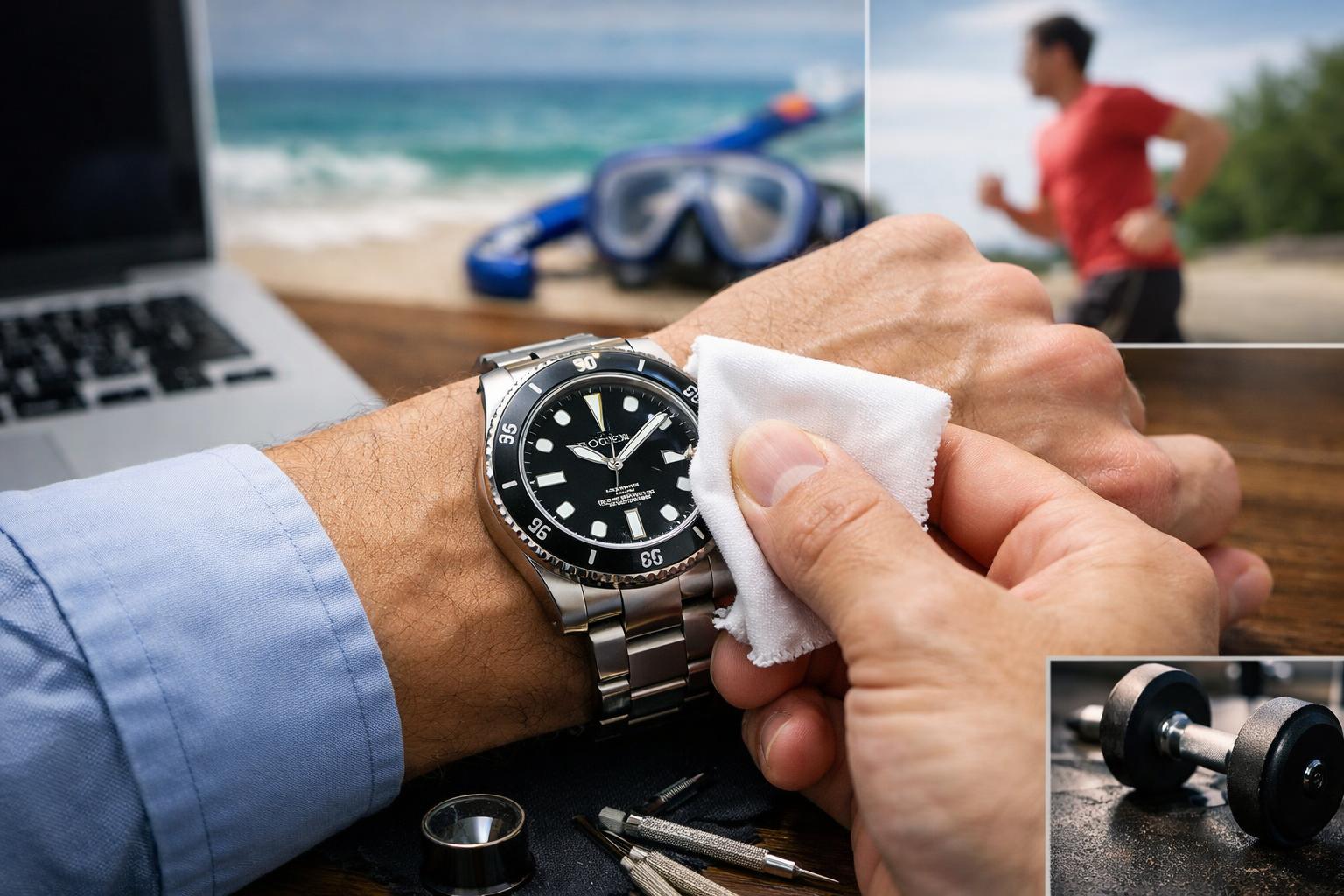 海やプールで使用した後は、必ずリューズがしっかりとねじ込まれていることを確認し、流水(強い水圧は避ける)で時計全体を丁寧に洗い流してください。 その後、柔らかい布で水分を優しく拭き取り、自然乾燥させましょう。この一手間が、時計のコンディションを長く保つ秘訣です。