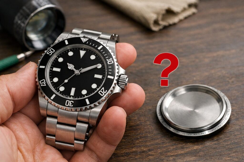 まずは落ち着いて、6時側のケース側面や文字盤内側のルーレット刻印をチェックしてみてくださいね。ブレスレットを外さないと見えないことも多いので注意が必要です。